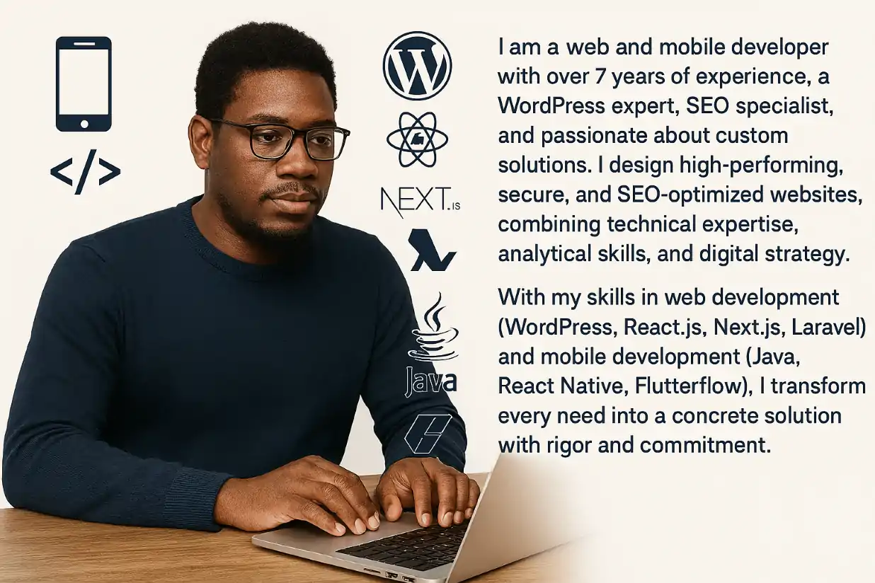 Je suis un développeur web et mobile avec plus de 7 ans d'expérience, expert WordPress, SEO et passionné par les solutions sur mesure. Je conçois des sites performants, sécurisés et optimisés pour le référencement, en alliant maîtrise technique, sens de l'analyse et stratégie digitale.