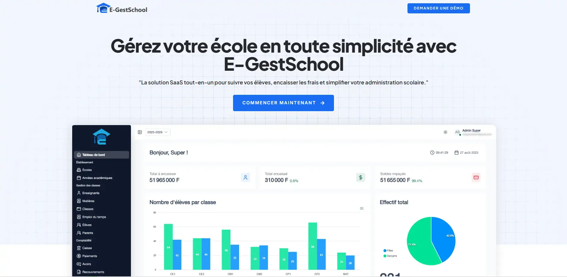 Site web de présentation d'un SaaS tout-en-un pour suivre les élèves, encaisser les frais et simplifier l'administration scolaire.